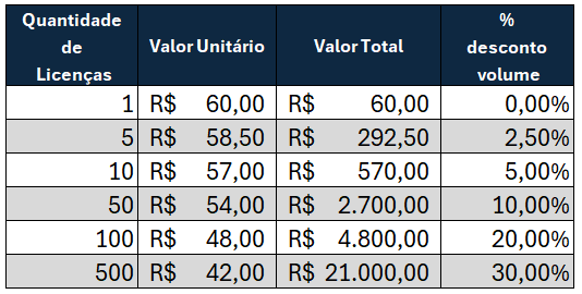 O desconto volume será oferecido para quem adquirir os pacotes com as seguintes quantidades de licenças: